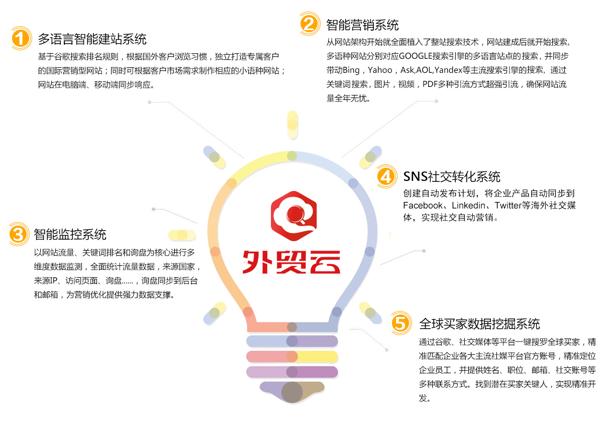 通过大数据分析与预测,运用强大的搜索引擎营销和SNS社交媒体营销技术,帮你带来精准流量和优质询盘。